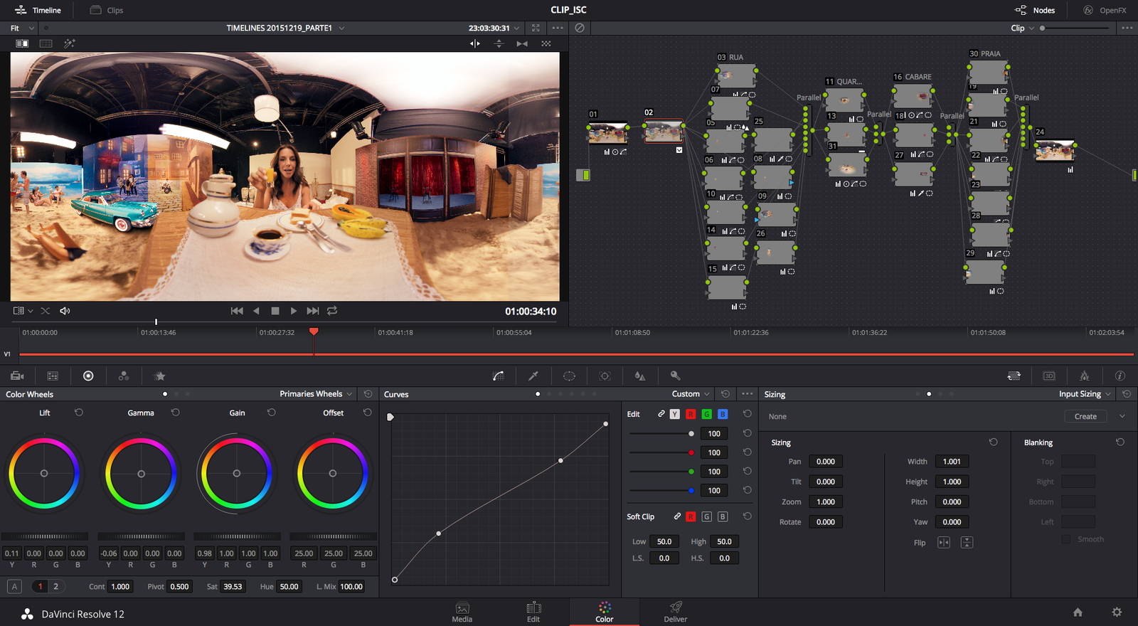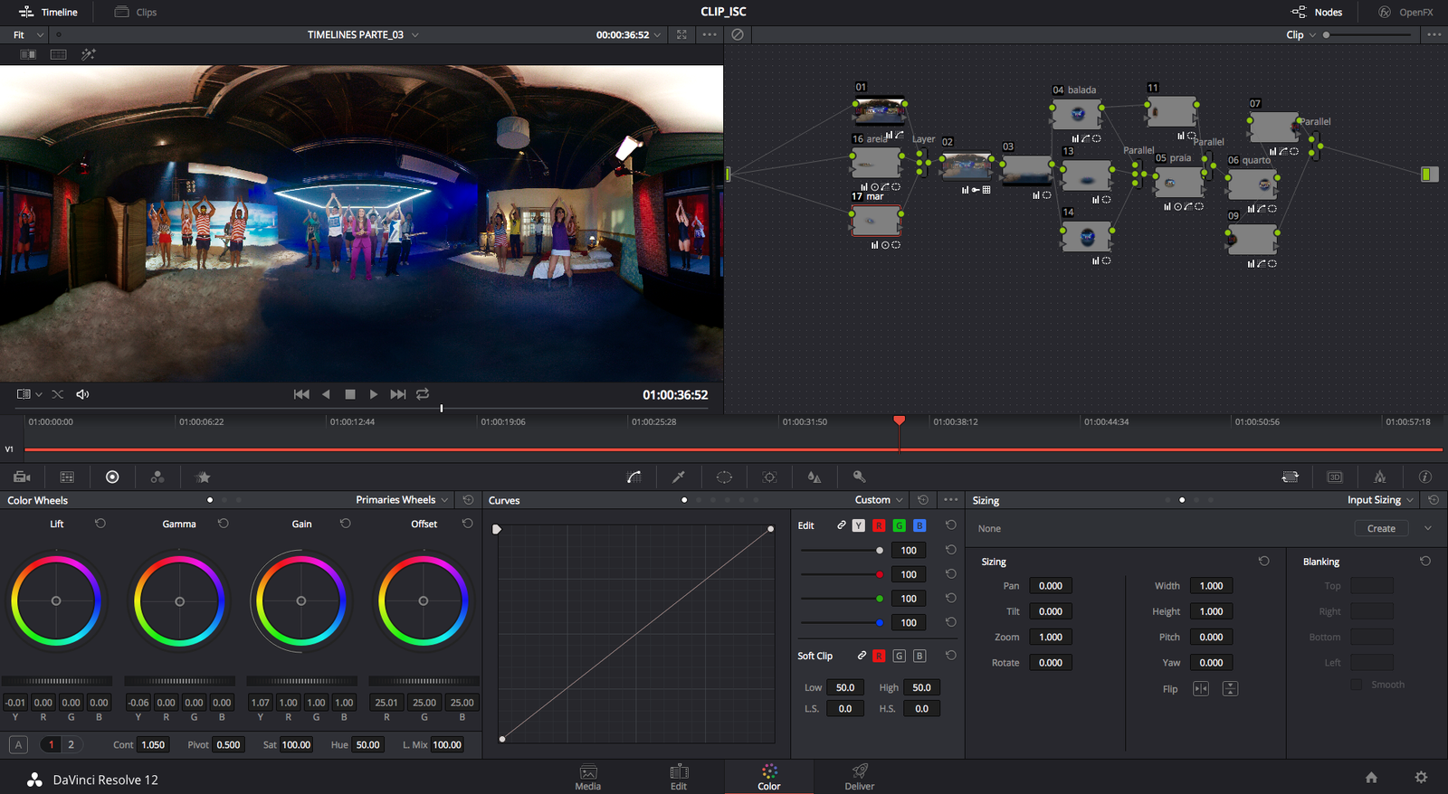 Para criar o clipe de realidade virtual que dá ao público a sensação de estar no set com a Ivete Sangalo, a equipe da O2 Pós trabalhou com uma imagem plana aberta e que depois foi “projetada” numa esfera virtual 360º. Isso acabou resultando num video com aspecto e resolução bem diferentes de formatos para telas tradicionais, mas o DaVinci Resolve Studio é capaz de trabalhar com qualquer formato, mesmo atípico, sem problemas.
